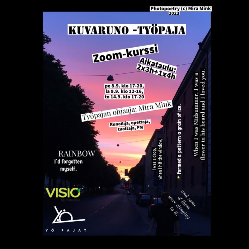 Kurssin vetäjä: runoilija Mira Mink, FM, opettaja, runoilija (oik.nimi Mirka Keini) Mira Mink on helsinkiläinen taiteilija, opettaja, tuottaja ja runoilija. Mink on julkaissut viisi omakustannetta viimeisimmät: Äänikirjamaisesti I ja Collection of Photopoetry (2022). Minkin taideprojekteja ovat taidenäyttelyt ja avoin lava-tapahtumien järjestäminen. Kuvarunoteoksen runokuvateoksia olivat esillä lyhyesti jo Venice Artfactoryyn kuuluvassa ”Navigating the city” -näyttelyssä - ne ovat käännettyinä myös italiaksi. Esillä myös täällä julkaistun kirjan lisäksi: https://express.adobe.com/page/ocfxwfHBaLuSW/